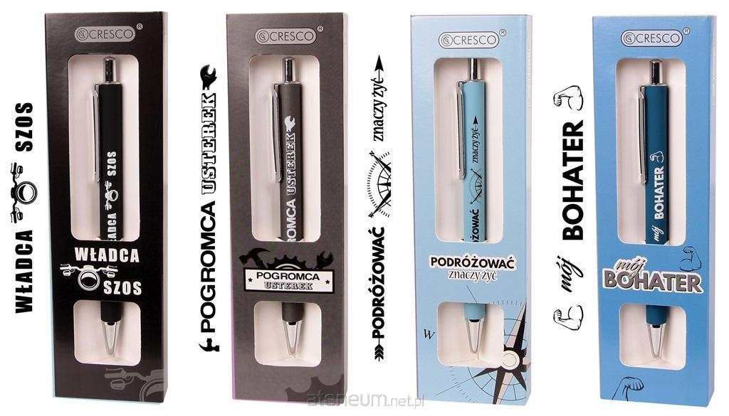 Kolorystyka męska ze srebrnymi wykończeniami. Nadruk to 4 MOTTA: "Władca szos", "Pogromca usterek", "Podróżować znaczy żyć", "Mój bohater". Dodatkowo wzbogacony nadruk o wyjątkową grafikę. Długopis zapakowany w prezentowe etui GB, w sam raz na upominek dla NIEGO.