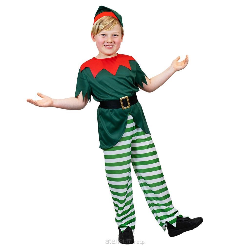 Kostium elfa dla dziecka. W skład zestawu wchodzi czapka, bluzka z kołnierzykiem oraz spodnie i pasek. Zielona czapka obszyta u dołu czerwonym pasem ma wszytą gumkę, co ułatwia dopasowanie. Bluzka jest w kolorze zielonym z czerwonym kołnierzykiem. Spodnie z gumką w pasie są w białe oraz zielone pasy. Czarny pasek posiada plastikową klamrę w złotym kolorze. Pasek zapina się na rzep. Elf to idealny dziecięcy strój na zabawę tematyczną lub świąteczne przedstawienie. Strój w rozmiarze: M (120-130 cm).