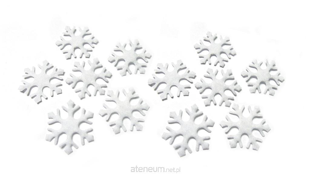 Element dekoracji do mocowania za pomocą szpileczek bądź kleju, 12 sztuk w opakowaniu. Wymiar śnieżynki 3,5 cm.