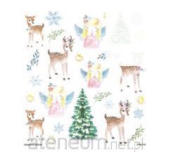 Naklejki papierowe brokatowe choinki zielone 24 x 35 mm, renifery złote 60 x 28 mm, gwiazdki zielone 11 mm, gwiazdki złote 22, 15, 12 mm. Plansza 125 x 180 mm.