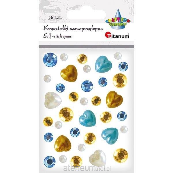 Kryształki samoprzylepne mix wzorów,tonacja złoto-niebieska 36 szt. Rodzaj: okrągłe 12, 8 mm, perełki serca 14 x 14 mm i perełki okrągłe 6 mm.