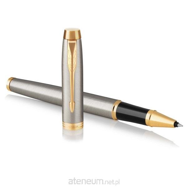 Szczotkowany metal z poprzecznym szlifem i złotymi wykończeniami oraz rozpoznawalny klip marki PARKER w kształcie strzały