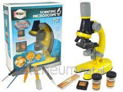 Nowy, edukacyjny zestaw dla młodego naukowca mikroskop + akcesoria, jest to świetny sposób na wprowadzenie dziecka do świata nauki i przyrody. Mikroskop posiada wszystko co potrzebne jest do oglądania mikroświata. Soczewki w mikroskopie dają powiększenie 100x 400x 1200x W skład zestawu wchodzi: - mikroskop - pęseta - gotowy preparat na szkiełku - 4 szkiełka do przygotowania preparatów - 2 probówki - pudełeczko - naklejki Mikroskop zasilany jest bateriami 2xAA brak w zestawie. Posiada żaróweczkę podświetlającą preparaty. Zapakowany w kolorowe pudełko idealnie nadaje się na prezent. Wymiary mikroskopu: 21 x 12 x 8 [cm] Wymiary opakowania: 24x19x9 cm