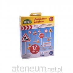 Wysokie (23 cm) światła uliczne na baterie. Oprócz tego w zestawie osiem różnych znaków drogowych.