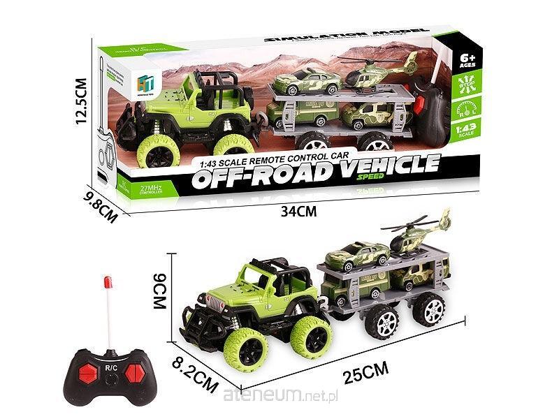 Auto na radio wojskowe na dużych kołach z przyczepą.