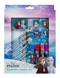 Zestaw kreatywny Kraina Lodu z pieczątkami. Zawartość: blok pieczątek, 4 markery, 10 plakatów A5, arkusz naklejek (10,00 x 10,00 cm), 4 małe stemple z różnymi motywami, 6 kredek