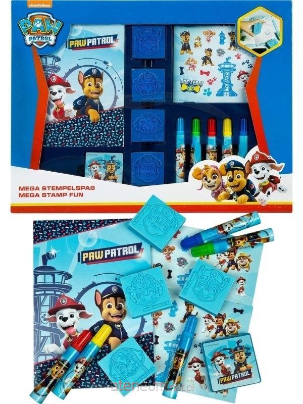 Kreatywny zestaw z ulubionymi postaciami z bajki Psi Patrol. Zawartość: 4 pieczątki, 5 pisaków, 1 notatnik, plastikowe pudełeczko z gąbką nasączoną nietoksycznym tuszem, zestaw naklejek.