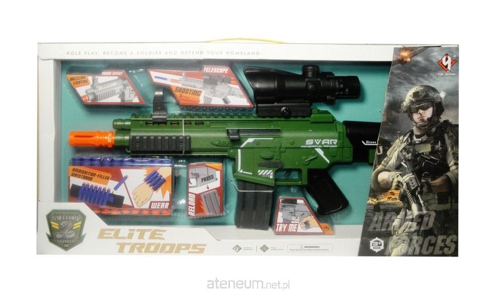 Plastikowy karabin na strzałki. Karabin w zestawie z 10 strzałkami. Podczas strzału zabawka wydaje 3 rodzaje dźwięków, a także świeci kolorowymi światełkami.#&Produkt działa na baterie typu AAA. Baterie są załączone do zabawki.#&Podane wymiary są wymiarami opakowania. #&Zabawka zapakowana w kartonowe opakowanie z okienkiem. #&Produkt dla dzieci od 3 lat.