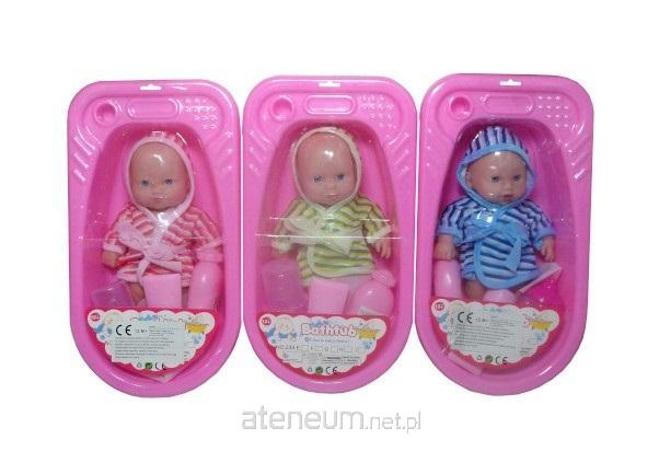 Plastikowa wanienka z lalką w szlafroku wraz z innymi akcesoriami do kąpieli jak: butelka, ręcznik, płyn do kąpieli . Zabawka rozwija u dziecka opiekuńczość, troskę o drugą osobę.#&Zabawka przykryta jest przezroczystym kloszem. #&Produkt dostępny dla dzieci od 12 miesiąca życia. #&Produkt występuje w kilku wersjach kolorystycznych, wybierany losowo. Cena dotyczy jednej sztuki. #&