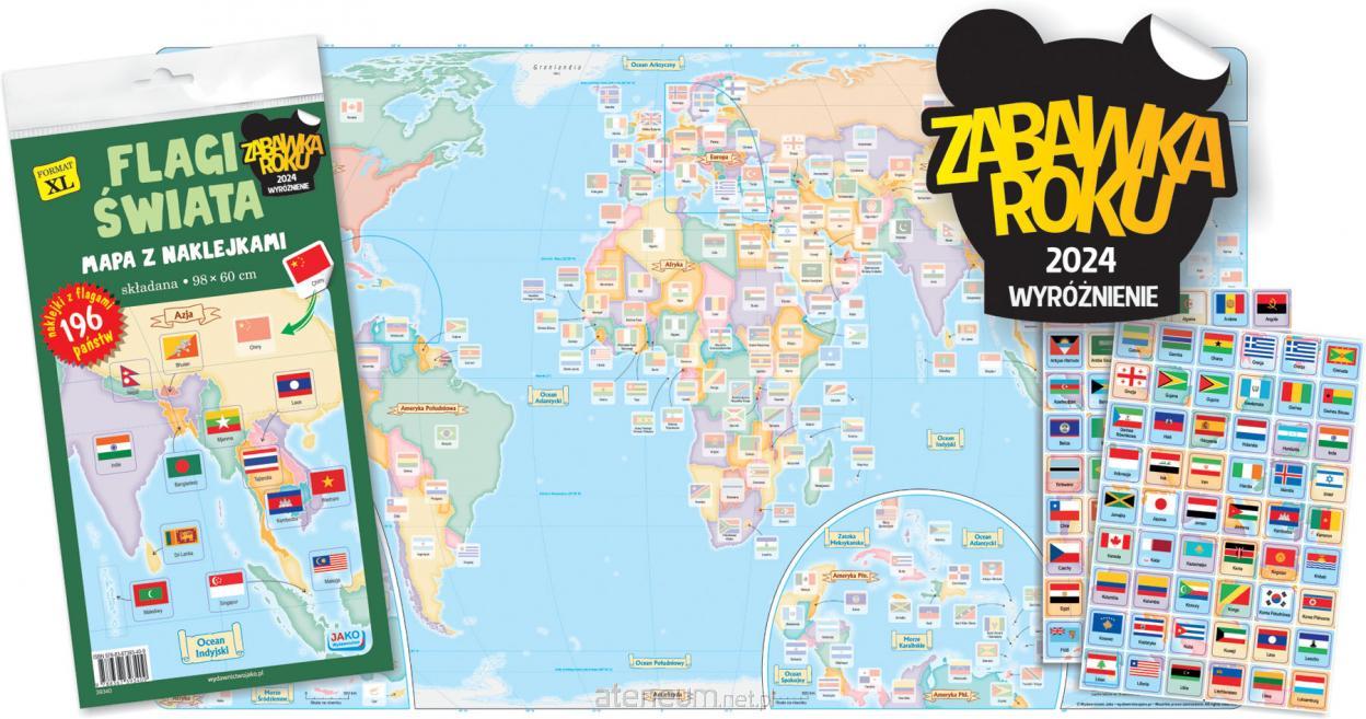Dzięki tej pozycji dzieci mogą nie tylko poznać flagi wszystkich państw, lecz także dowiedzieć się, gdzie poszczególne kraje znajdują się na mapie świata. Zestaw składa się z mapy o wymiarach 98 x 60 cm oraz 213 naklejek (zawierających flagi 196 państw, z których 17 występuje podwójnie, ponieważ są stosowane także w powiększonych fragmentach mapy). Naklejki zawierają flagę i nazwę państwa. Należy znaleźć na mapie przypisane do danego kraju miejsce i wkleić naklejkę. Na odwrocie mapy umieszczono dodatkowe informacje o państwach, takie jak: stolica, kontynent, liczba ludności i powierzchnia. Mapa uzupełniona naklejkami świetnie się sprawdzi jako edukacyjny plakat na ścianę.