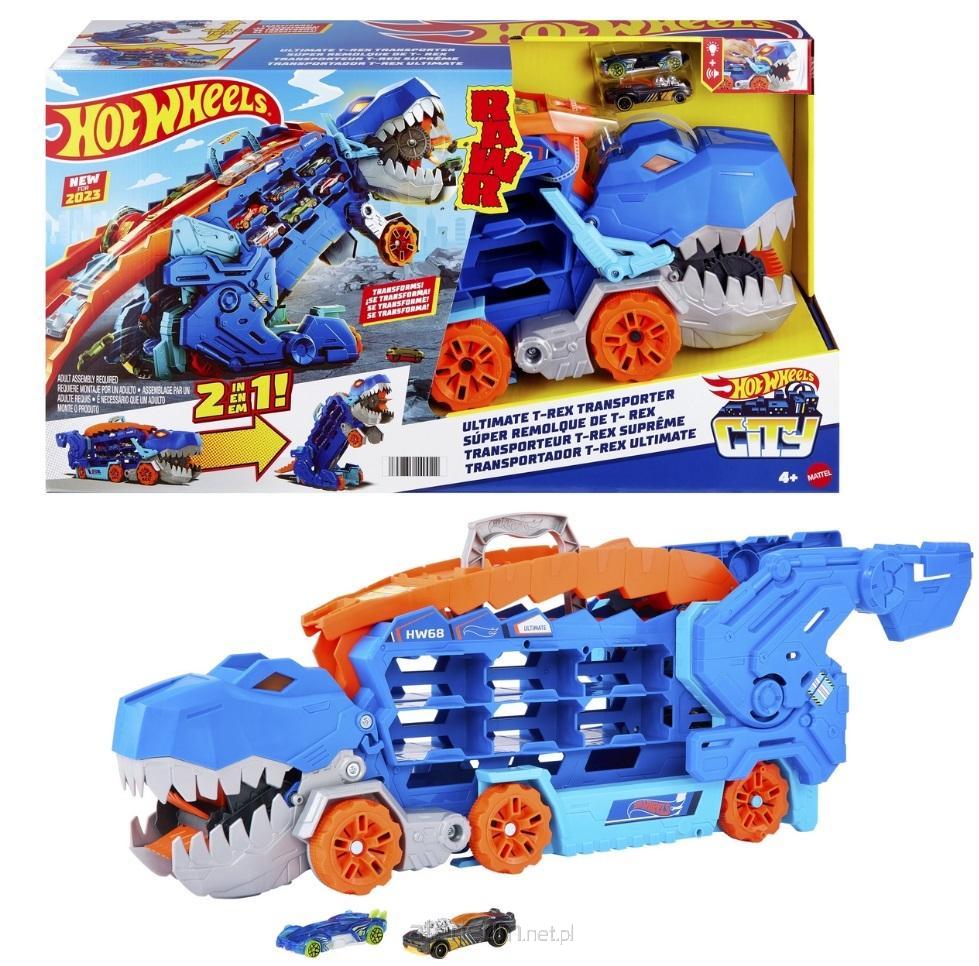 Hot Wheels City T-Rex Mega Transporter Zestaw może pożreć i przechowywać ponad 20 samochodzików w skali 1:64, a potem zamienić się w warczącego T-Rexa z torem na grzbiecie.W trybie transportera pociągnij za uchwyt i podziwiaj, jak pożera pojazdy w skali 1:64 na swojej drodze. Opuść ogon i przekształć pojazd w mechanicznego T-Rexa w dwutorową trasą wyścigową. Możesz też wypuszczać pojazdy wprost z paszczy!