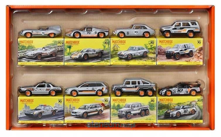 Zamknięte opakowanie premium ma klasyczny design, aby uhonorować dziedzictwo Matchbox. Ten kolekcjonerski pakiet premium, świętujący 70. rocznicę firmy Matchbox, zawiera osiem pojazdów w skali 1:64. Odlewany pojazdy z okazji 70. rocznicy są pokryte platynowym lakierem, wyróżniają się szczegółowymi dekoracjami, metalową konstrukcją i oponami True Grip. Niektóre mają również ruchomą część, taką jak otwierane i zamykane drzwi, pokrywa bagażnika lub klapa silnika. Zestaw zawiera 8 odlewanych pojazdów, w tym 1 wyjątkowy pojazd, i jest idealny dla kolekcjonerów.