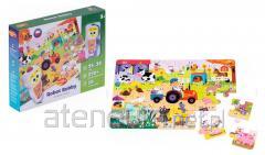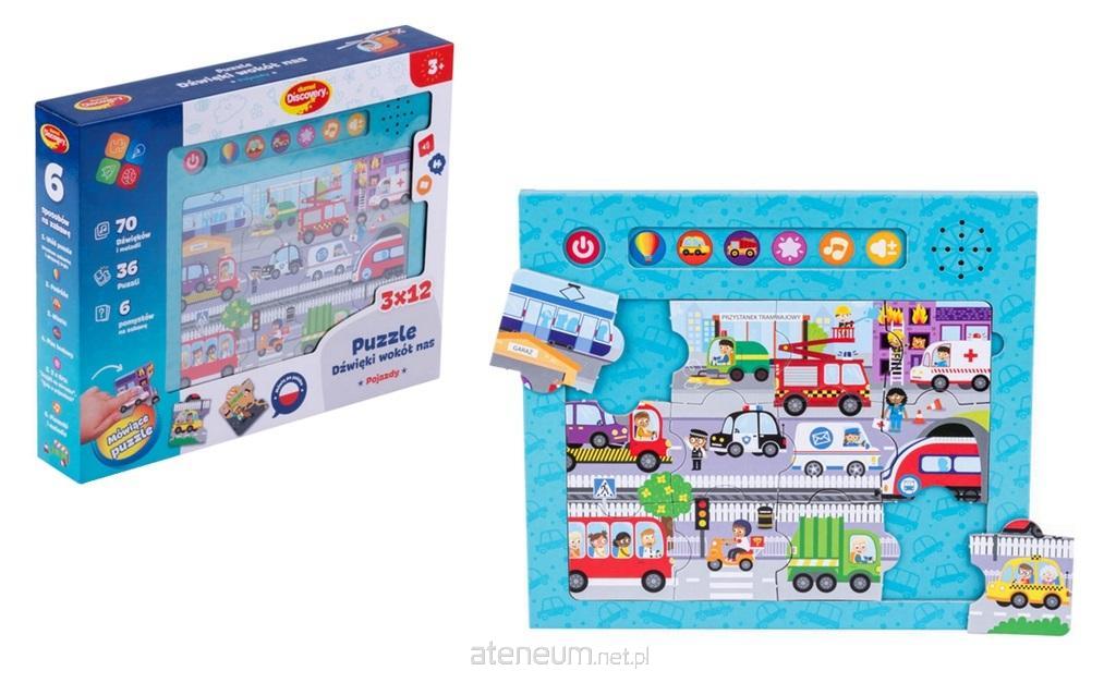 Z mówiącymi puzzlami poznawanie pojazdów to wspaniała zabawa! W zestawie znajduje się aż 36 puzzli, z których ułożyć można trzy różne obrazki, przedstawiające kolejno: pojazdy do podróżowania, pojazdy miejskie oraz maszyny budowlane. Praktyczna podkładka, posiada wytyczoną przestrzeń, sugerującą jakie mają być wymiary obrazka, co ułatwi najmłodszym układanie. Na górze podkładki znajdują się kolorowe przyciski z obrazkami, odpowiadające za uruchamianie poszczególnych trybów. Na malucha czekają zgadywanki: rozpoznawanie pojazdów oraz quiz, a także wiele dźwięków i melodii