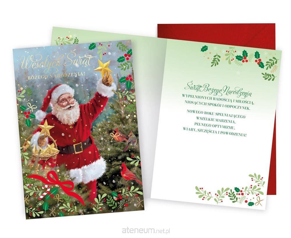 Kartka wielkości B6, zdobiona w zależności od wzoru metaliczną folią lub brokatem. Każda kartka posiada kolorowe życzenia w środku i dopasowaną kopertę w komplecie. Wymiary karnetu po złożeniu: 11,7 x 16,6 cm.