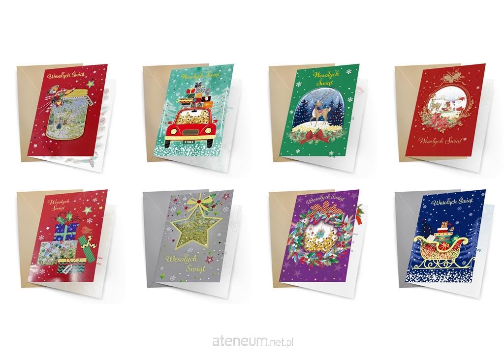 Kartki świąteczne, wyjątkowe połyskujące wykończenie. Każda kartka ma nadrukowane życzenia. Do każdego kartki dołączona jest koperta w dopasowanym do projektu kolorze. Pakiet 8 wzorów po 1 sztuce.