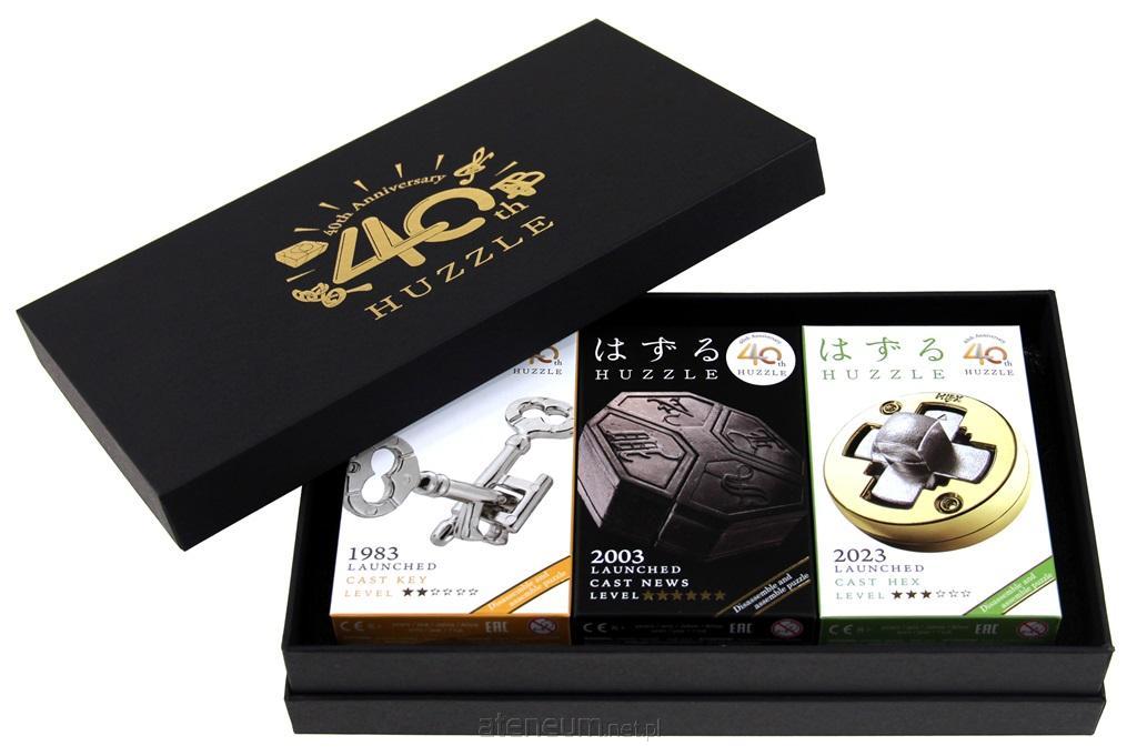 Czterdzieści lat wspaniałej historii w jednym pudełku! W eleganckim etui znajdują się trzy ekskluzywne łamigłówki, upamiętniające trzy kamienie milowe marki Hanayama. HUZZLE CAST KEY - POZIOM 2/6 Łamigłówka Key została wydana w 1983 roku, a więc w pierwszym roku istnienia marki Hanayama. Jest to jedna z najlepiej sprzedających się łamigłówek z serii Huzzle Cast, dzisiaj już niedostępna. Aby odpowiednio uczcić jubileusz, Cast Key zmienił swój kolor na srebrny. Może łamigłówka nie należy do najtrudniejszych, ale trzymacie w rękach 40 lat historii! HUZZLE CAST NEWS - POZIOM 6/6 Łamigłówka News została wydana w 2003 roku, a więc w dwudziestym roku istnienia marki Hanayama. Jest to jedna z najpopularniejszych łamigłówek z serii Huzzle Cast, prawdziwy bestseller. Aby odpowiednio uczcić jubileusz, Cast News zmienił swój kolor na szykowną czerń. Łamigłówka posiada najwyższy możliwy poziom trudności, a kluczem do jej rozwiązania jest słowo "igła". HUZZLE CAST HEX - POZIOM 3/6 Łamigłówka Hex została wydana w 2023 roku, a więc w czterdziestym, jubileuszowym roku istnienia marki Hanayama. Jest to jedna z najnowszych propozycji z serii Huzzle Cast. Aby odpowiednio uczcić jubileusz, Cast Hex przybrał nowe srebrno-złote barwy. Czy potrafisz usunąć z zewnętrznego dysku element w kształcie krzyża? Seria "Huzzle" to łamigłówki dla dorosłych, które wyróżniają się trzema wyjątkowymi elementami: innowacyjnymi pomysłami, bardzo wysoką jakością wykonania oraz unikalnym designem. Zagadki oparte są na koncepcji dwóch prostych pytań: czy możesz rozdzielić elementy? czy możesz złożyć je ponownie razem? Wszystkie wzory zmuszają do myślenia i uwolnienia twórczej wyobraźni, a każde rozwiązanie to umiejętne połączenie pracy intelektu i... obu rąk. Czasami będzie ono trudne i pokrętne, czasami łatwe i przyjemne. Seria "Huzzle" posiada sześć poziomów trudności. Zaleca się, aby zacząć od najłatwiejszego i piąć się stopniowo do góry, ale jest to tylko sugestia. W wielu przypadkach, wszystko zależy od naszych indywidualnych predyspozycji. Można oczywiście wybrać swoją łamigłówkę na podstawie projektu lub nazwy, która po prostu nam się spodobała. Często pierwsze, przypadkowe z nimi "spotkanie", staje się początkiem wielkiej pasji. W bogatej i różnorodnej ofercie łamigłówek "Huzzle", każdy znajdzie coś dla siebie!