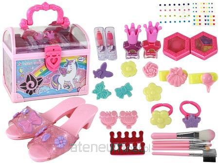 Zestaw Kosmetyków Do Makijażu DIY Akcesoria Kuferek Kuferek ma różowy kolor z pięknym motywem jednorożca, co nadaje mu uroku i dziewczęcej estetyki. Posiada różową rączkę transportową, co ułatwia przenoszenie i zabieranie zestawu w podróż. Zamykanie kufra wykonane jest w kształcie serduszka, co dodaje mu romantycznego wyglądu. Zestaw zawiera różowe klapki na obcasie, które umożliwiają dziecku odgrywanie roli eleganckiej osoby. W zestawie znajduje się 5 różnych pędzli do makijażu, które pozwalają na tworzenie różnych efektów makijażu. Dostępny jest róż do policzków, który można aplikować na policzki, nadając uroczy rumieniec. Zestaw zawiera 3 różne kolory cieni do powiek, co umożliwia tworzenie różnych makijaży oczu. Aby kompletnie zadbać o urodę, zestaw zawiera dwa lakiery do paznokci w kolorze różowym i fioletowym, które można użyć do malowania paznokci. Separatory do paznokci pozwalają na wygodne malowanie paznokci bez rozprowadzania kolorów. W zestawie znajdują się dwie szminki w odcieniach koloru różowego, co pozwala na stworzenie delikatnego makijażu ust. Ten uroczy zestaw do makijażu dla dzieci w kuferku z jednorożcem jest idealny dla małych miłośniczek kosmetyków i zabawy w makijaż. Pozwala na rozwijanie wyobraźni, kreatywności oraz eksperymentowanie z różnymi stylami makijażu i stylizacjami paznokci, jednocześnie bawiąc się w zabawę w dorosłą kobietę. Zawartość zestawu : - kuferek - różowe klapki -zestaw pięciu pędzli - zestaw przypinek do klapek - dwa separatory do paznokci - róż - trzy cienie do powiek - dwa lakiery do paznokci - dwie szminki - oryginalne opakowanie Wymiary klapek : 20 cm x 6 cm x 5 cm x