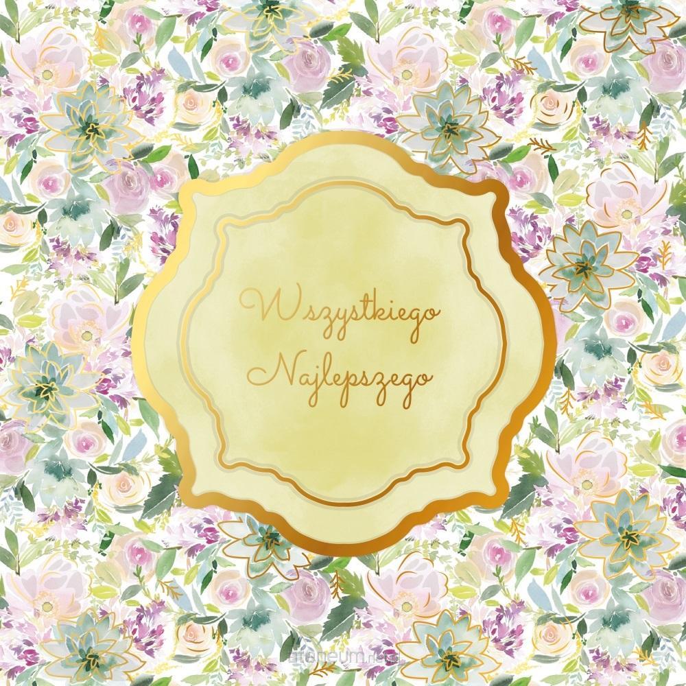 Karnet w formacie 15 x 15 cm. Wydrukowany na wysokiej jakości papierze. Karnet z tłoczonymi wzorami na całej powierzchni oraz złoceniem. W zestawie kolorowa koperta.