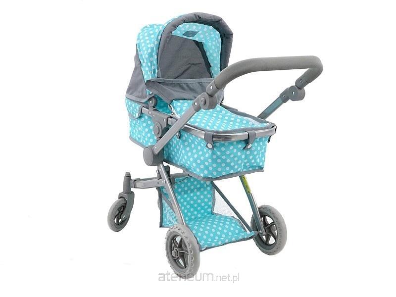Wózek dla lalek, głęboki, obrotowe kółka, składany daszek, regulowana i przekładana rączka, z koszem, funkcja spacerówki, nosidełko.