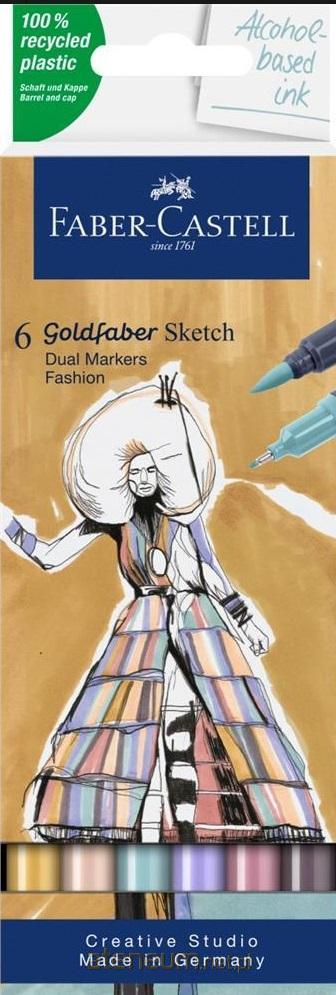 Zestaw tematyczny pisaków dwustronnych Goldfaber Sketch Faber-Castell 6 szt. - fashion. Doskonałe dla artystów i hobbystów, zachwycają wszechstronnością zastosowania. Zapewniają łatwe blendowanie bez smug i tworzenie idealnych przejść kolorystycznych. Posiadają dwie końcówki: miękką, elastyczną końcówkę pędzelkową do zadań artystycznych i cienką końcówkę 0,6 mm do konturów i detali. Z szybkoschnącym i permanentnym tuszem na bazie alkoholu. Zatyczki i korpus są wykonane w 100% z materiału pochodzącego z recyklingu, w związku z czym mogą pojawić się niewielkie różnice kolorystyczne. Neutralne pod względem emisji dwutlenku węgla produkcja.