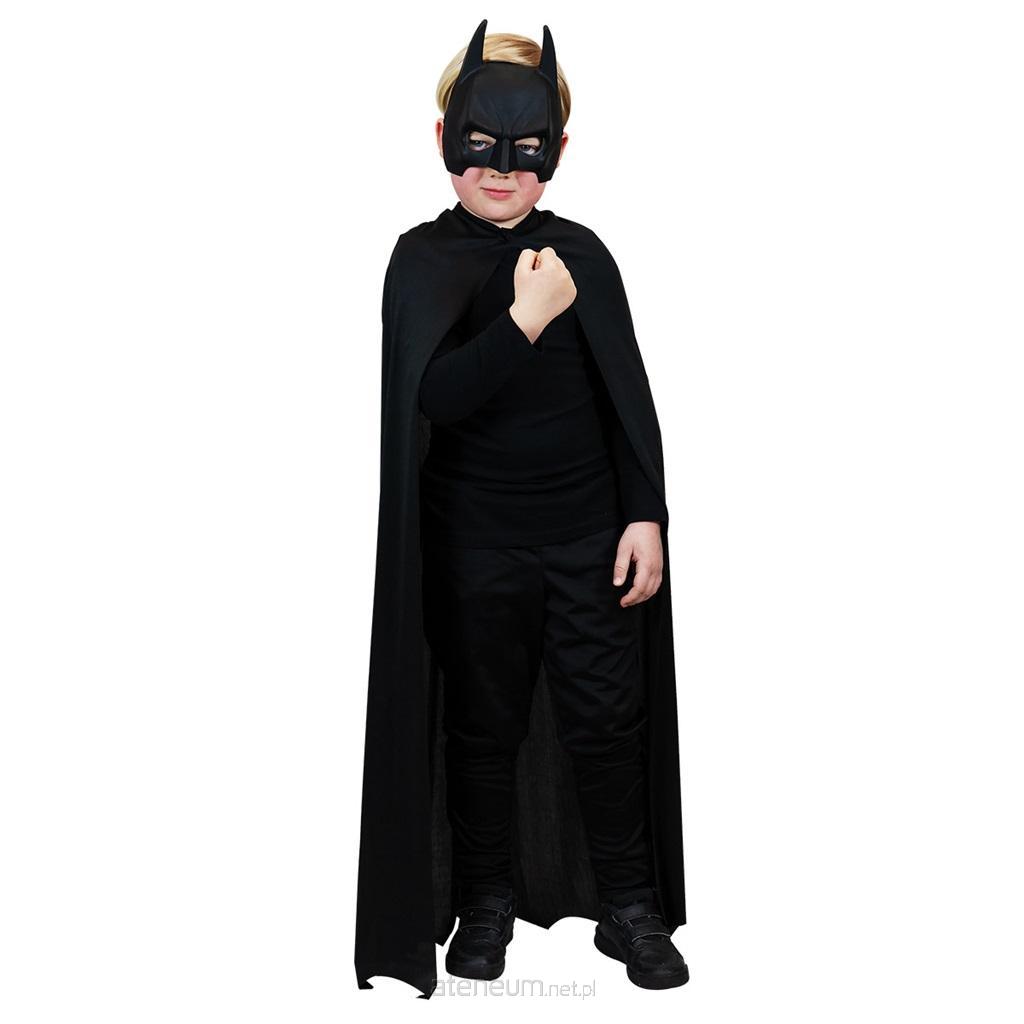 Maska Batmana z peleryną. Oryginalny produkt licencjonowany. Maska jest w kolorze czarnym. Wykonana z wytrzymałego tworzywa. Posiada otwory na oczy i kończy się na wysokości nosa. Na szczycie maski znajdują się uszy. Peleryna jest w kolorze czarnym. Jest wykonana z wytrzymałego, połyskującego, czarnego materiału. Posiada regulowany pasek, dzięki czemu można dopasować do potrzeb dziecka.