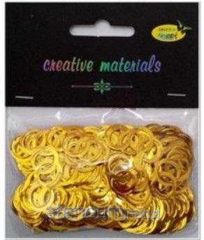 Elementy z folii Alu w kształcie dwóch obrączek w kolorze złotym . Pakowane w opakowania z eurozawieszką zawierające 15 gram elementów.