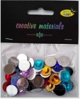 Elementy ozdobne z tworzywa 14 mm kryształki okrągłe z mikrostrukturą na brzegu w miksie kolorów . Pakowane w opakowania z eurozawieszką zawierające 15 gram elementów. Kod towaru :GH-K1409