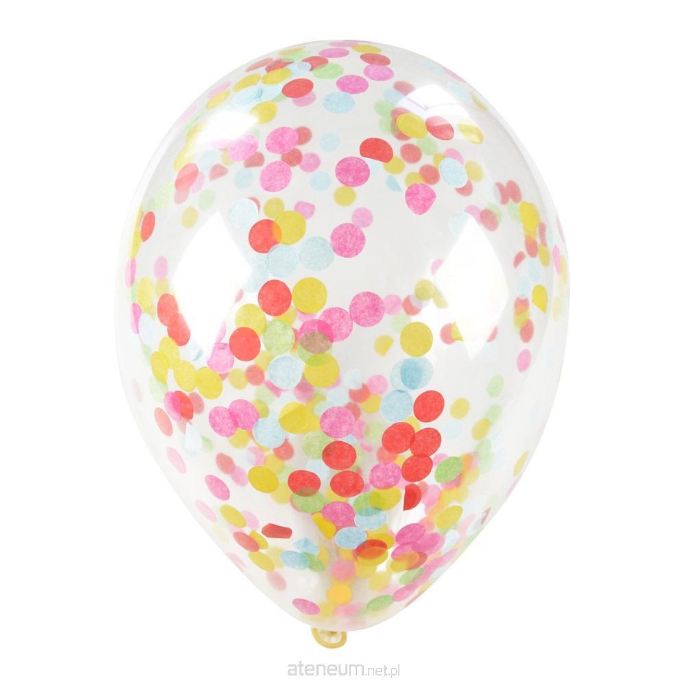 Balony lateksowe przezroczyste. Wewnątrz balonu znajduje się kolorowe konfetti z bibuły. Balon należy pompować pompką lub napełnić helem. Dla uzyskania jak najlepszego efektu warto naelektryzować balon przy pomocy suchej, miękkiej ściereczki, aby konfetti przyczepiło się do jego ścianek. Po napompowaniu osiągają wielkość aż 30 cm. W opakowaniu znajduje się 5 sztuk.
