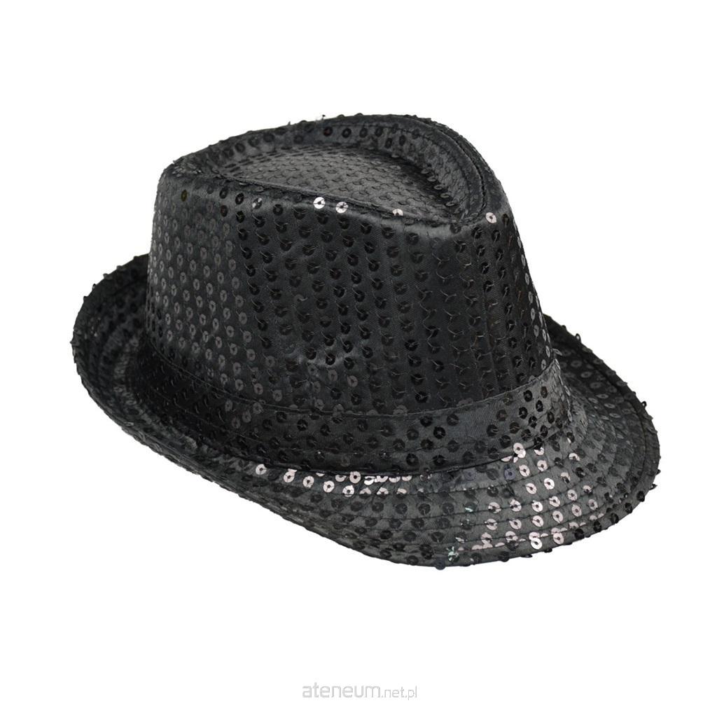 Imprezowy kapelusz w kolorze czarnym obszyty cekinami. Kapelusz ładnie mieni się w świetle. Gadżet na bal karnawałowy, zabawę tematyczną, bal przebierańców. Rozmiar uniwersalny dla osoby dorosłej.