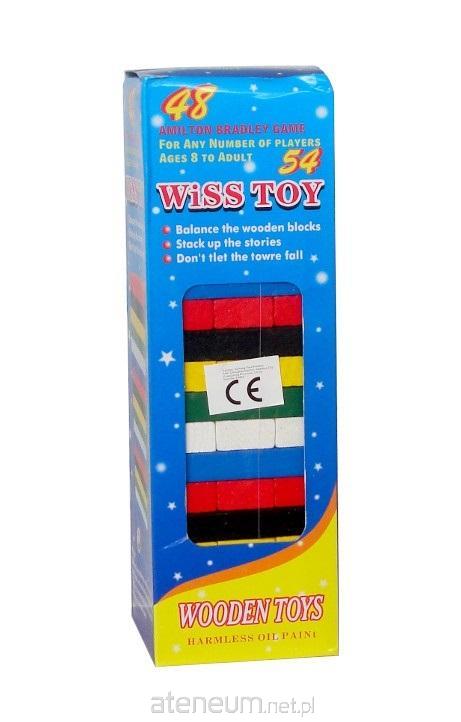 Drewniane klocki do układania, a także gra zręcznościowa. Zabawka przeznaczona dla dzieci powyżej 3 roku życia. Produkt zapakowany w kartonowe pudełko.