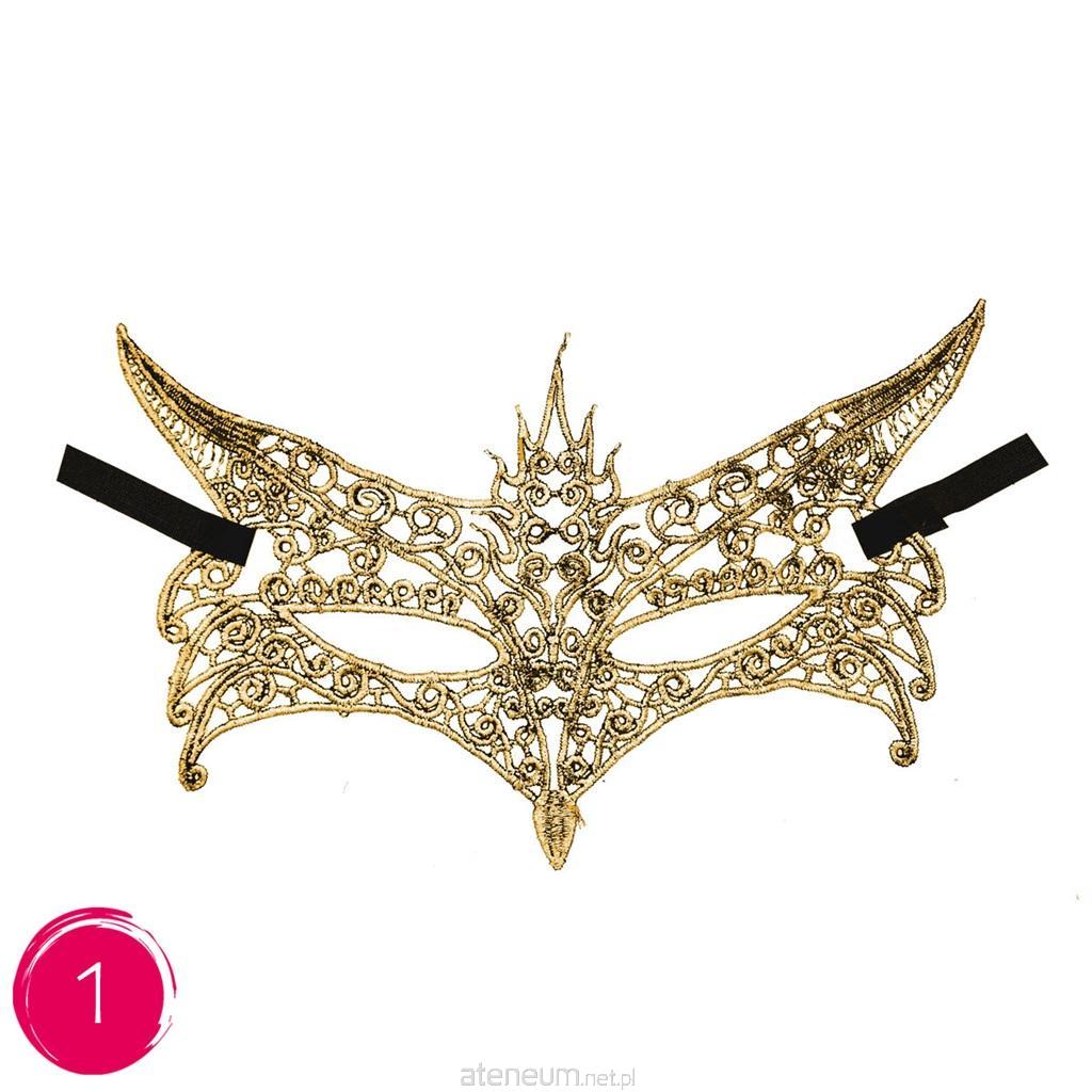 Koronkowa maska wenecka z czarną aksamitną wstążka. Dopasowany profil maski sprawia, że nie przeszkadza podczas zabawy. Eleganckie i efektowne uzupełnienie stroju. Rozmiar: 27 cm. Kolor: złoty.
