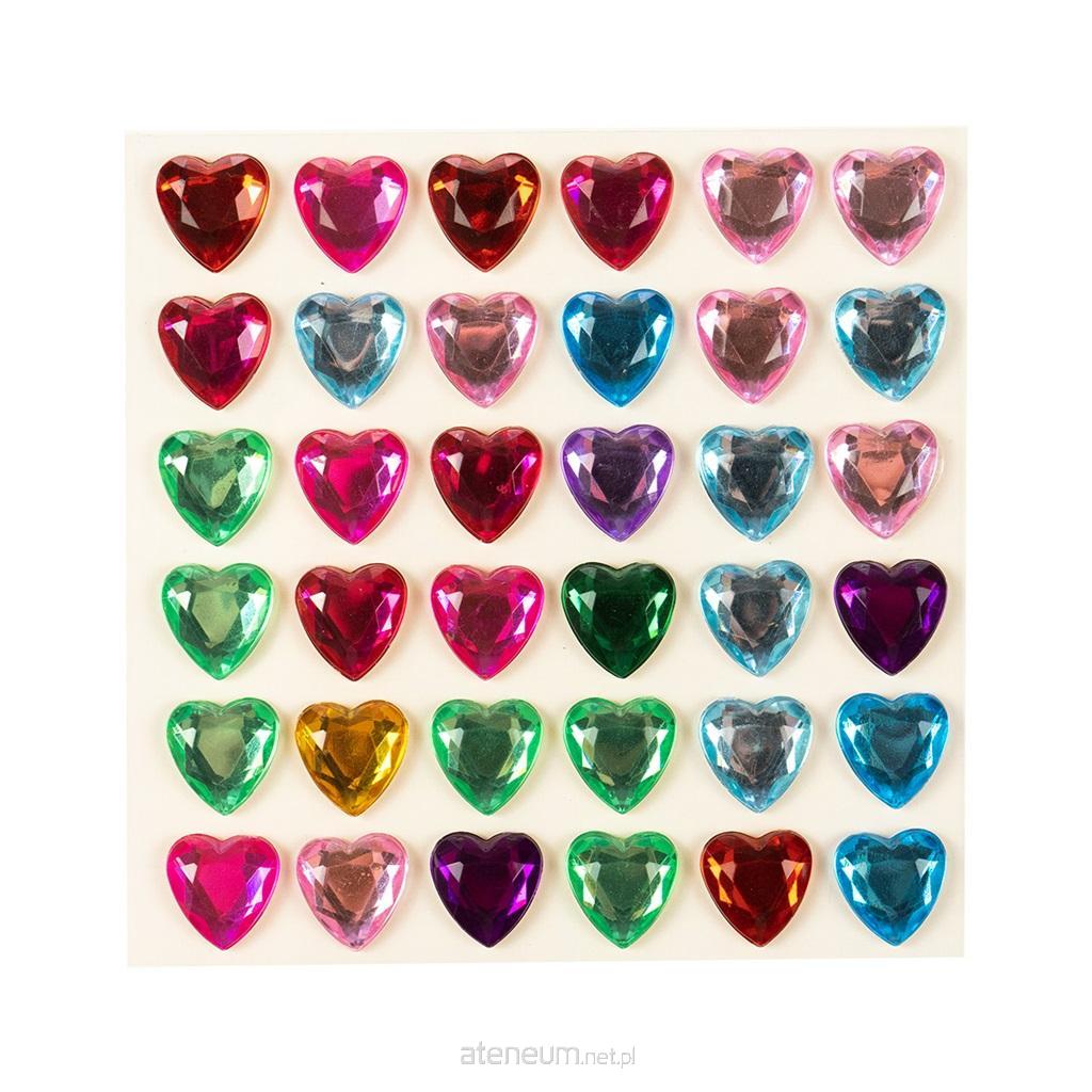 Dekoracyjne kryształki w kształcie kolorowych serduszek. Ozdobne diamenciki samoprzylepne, mix ozdób do prac kreatywnych, szkolnych, dekoracji kartek urodzinowych, zaproszeń, albumów ze zdjęciami, przedmiotów. 36 sztuk na blistrze o wymiarze 8 cm x 8 cm.
