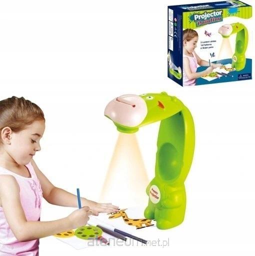 Projektor na biurko B/O, w zestawie - rozkładany projektor 29,5 cm, 18 slajdów, 6 flamastrów, notes. Dziecko wybiera sobie spośród dołączonych wzorów, obrazek, który chce namalować, wkłada go do górnej części rzutnika, włącza przycisk i rozpoczyna zabawę z malowaniem.