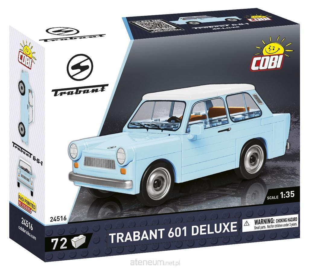 Model w skali 1:35 składa się z 72 klocków konstrukcyjnych COBI i bardzo wiernie oddaje charakterystyczne kształty oryginalnego Trabanta 601. Auto zostało opracowane w nowym jasnoniebieskim kolorze klocków, jeszcze bardziej zbliżonym do kultowego oryginału! Samochód posiada obracające się koła wyposażone w opony, które idealnie nadają się do poruszania modelem w trakcie zabawy. W naszych zestawach zrezygnowaliśmy z naklejek! Zostały one zastąpione trwałymi nadrukami, które nie ścierają się nawet w trakcie intensywnej zabawy. Klockowe autko to produkt zarówno dla wymagających kolekcjonerów, jak i młodych entuzjastów klasycznej motoryzacji! Dzięki prostej i intuicyjnej instrukcji budowa jest prosta i nie sprawi nikomu problemów! Trabant to marka samochodów osobowych produkowanych w NRD w kombinacie VEB Sachsenring Automobilwerke w Zwickau. Model 601 zadebiutował na rynku w 1964 roku i był produkowany aż do 1990 roku. Wersję De Luxe opracowano w roku 1967. W samochodach marki Trabant zastosowano kilka ciekawych technicznie rozwiązań. Były to m.in. karoseria z tworzywa sztucznego zwanego duroplastem. Charakteryzowała się ona temperaturą topnienia podobną do aluminium oraz podnosiła odporność auta na korozję i zgniatanie. Pozostałe warte uwagi rozwiązania to małolitrażowy silnik dwusuwowy, duże szyby oraz stosunkowo pojemne wnętrze. Samochód rozwijał zawrotną prędkość przekraczającą nieznacznie 100 km/h. Trabant zasłużył na miano kultowego auta pochodzącego z Niemieckiej Republiki Demokratycznej. Do dzisiaj pozostaje rozpoznawalnym i szalenie popularnym klasykiem w gronie pasjonatów motoryzacji. Na trwałe również wpisał się do kultury masowej. 72 wysokiej jakości elementy produkt na oryginalnej licencji TRABANT wyprodukowane w UE przez firmę z ponad 20-letnią tradycją, spełniają normy bezpieczeństwa dotyczące produktów dla dzieci, w pełni kompatybilne z innymi markami klocków konstrukcyjnych, klocki z nadrukami nie odkształcają się i nie bledną w czasie zabawy czy pod wpływem temperatury, skala modelarska 1:35 Wymiary modelu (dł x szer x wys): 10 cm (3.9") x 5 cm (2") x 4 cm (1.6")
