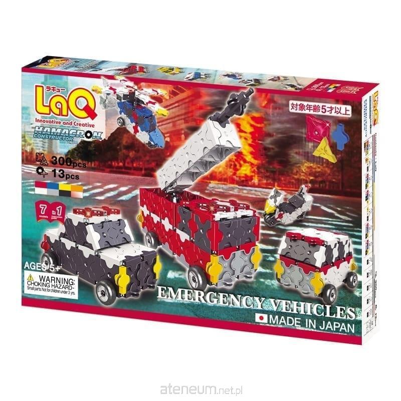 300 części; 13 specjalnych części Hamacron (w tym NOWOŚĆ - specjalne części Ball Joint Technique (złącza elastyczne); 7 schematów konstruowania: motocykl policyjny, karetka, samochód policyjny, helikopter, autobus policyjny, samochód patrolowy, wóz strażacki; 8 kolorów; Zalecany wiek: 5 + Części LaQ są wielokrotnego użytku, a z zestawu można zbudować 7 różnych modeli. MADE IN JAPAN