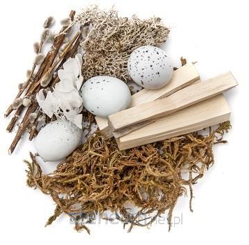 W zestawie znajdziesz m.in. mech bielony, bazie, białe, delikatnie nakrapiane jajka, gałązkę suszonej hortensji i kawałki drewna.