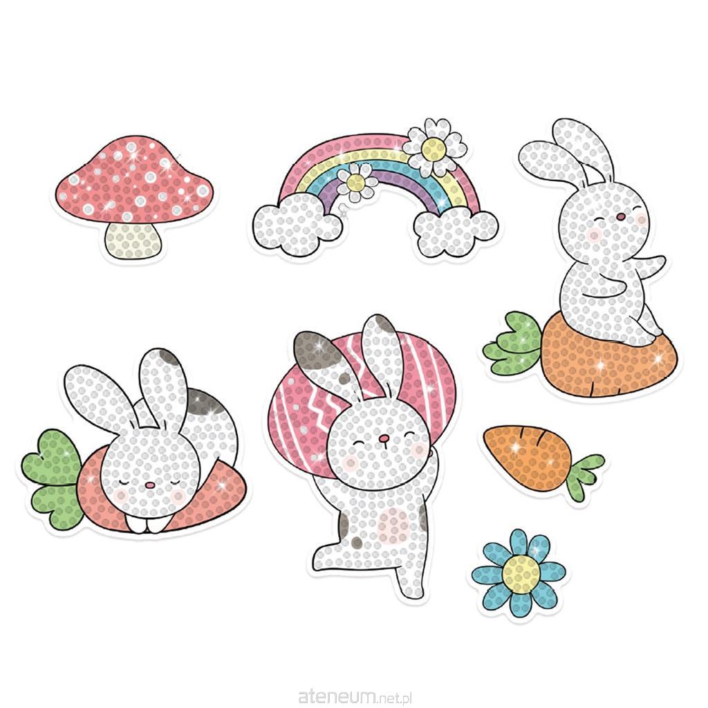 Haft diamentowy naklejki wesoły króliczek to 7 naklejek z transparentną, podkolorowaną folią do wyklejenia kolorowymi kryształkami. Dużym plusem jest niewielki rozmiar naklejek. Wyklejenie jednego elementu zajmuje dziecku mało czasu, dzięki czemu nie zniechęci się do kolejnych naklejek z zestawu.