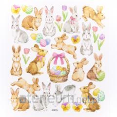 Urocze, wielkanocne naklejki papierowe przedstawiające króliczki i pisanki w sielskim, delikatnie rustykalnym stylu. Wszystkie naklejki są częściowo pokryte opalizującym brokatem.