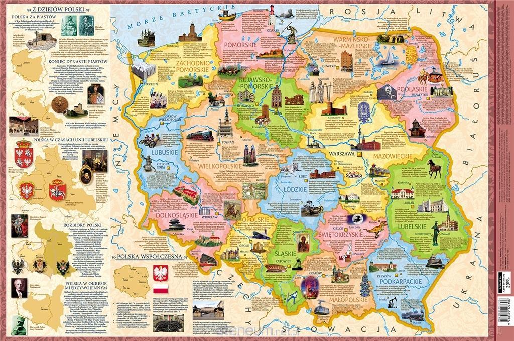 Podkładka powstała na podstawie Mappuzzle POLSKA REGIONY. To świetna pomoc w opanowaniu nazw województw i ich stolic, zapamiętaniu relacji wielkości i położenia ich siebie oraz w odniesieniu do Morza Bałtyckiego i granic z sąsiednimi państwami. W każdym województwie umieszczono obrazki z opisami wybranych zabytków lub atrakcji turystycznych. Podkładka zawiera także informacje o historii Polski, pokazuje jak granice naszego państwa zmieniały się na przestrzeni wieków, pozwala porównać powierzchnię Polski w kluczowych momentach jej historii.