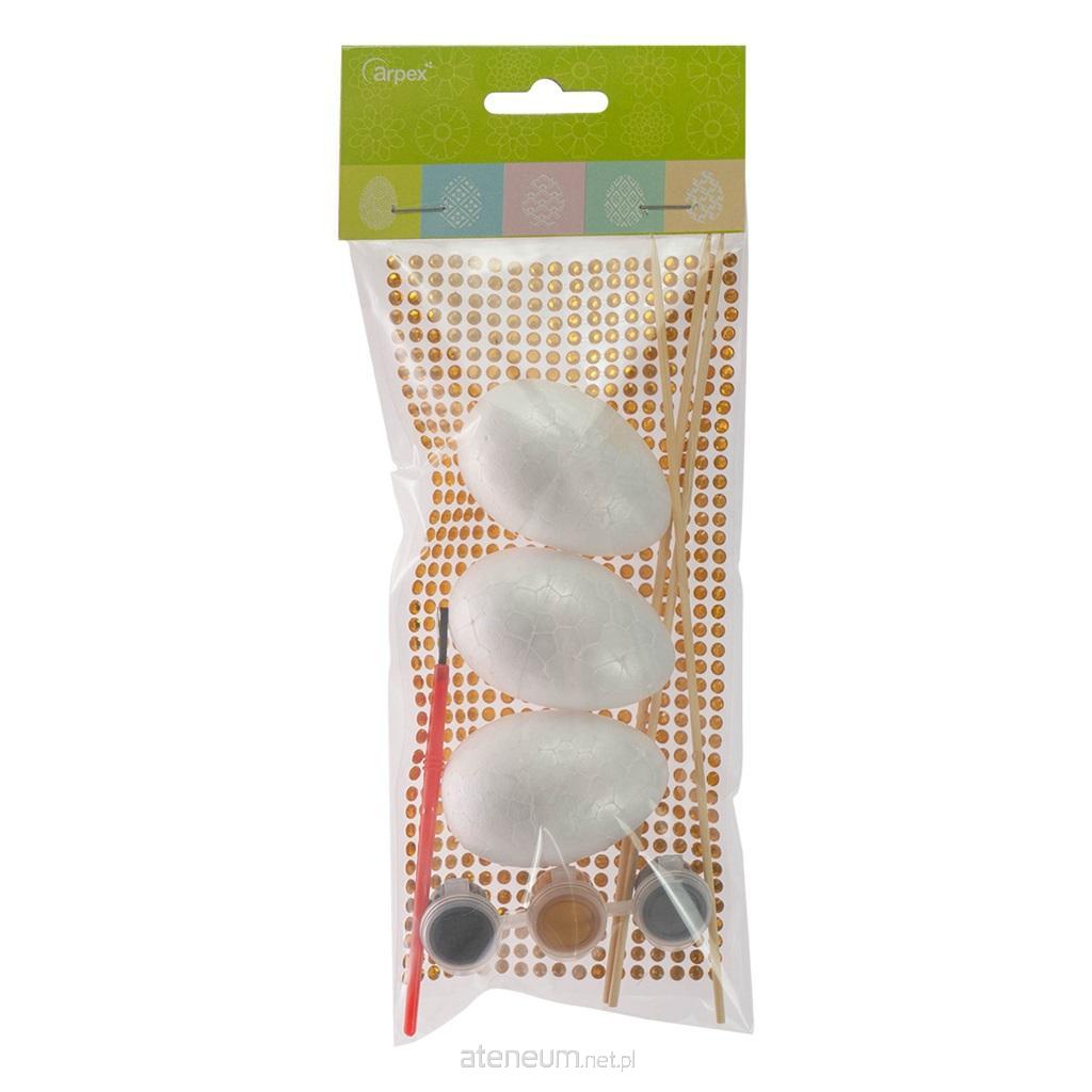Wielkanocny zestaw do dekoracji samodzielnej. W skład zestawu wchodzą: - 3 jajka styropianowe, - 3 farbki: złota, srebrna, czarna, - 3 patyczki, - kryształki samoprzylepne, - pędzelek. Kreatywny zestaw do stworzenia dekoracji wielkanocnych.