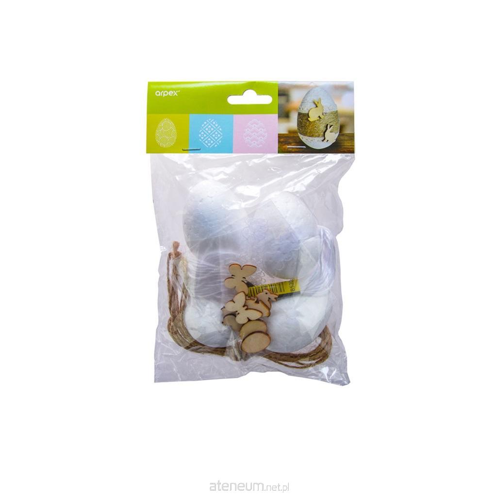Zestaw dekoracji kreatywnych - rustykalne pisanki. 1 komplet. Skład zestawu: 4 jajka styropianowe, 1 sznurek (280 cm), mulina biała (2x8 m), koronka (52 cm), drewniane elementy dekoracyjne - 8 szt.