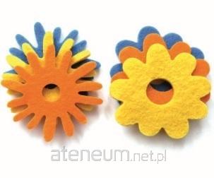 Opakowanie zawiera 6 kwiatków z filcu w dwóch kształtach w kolorach: niebieskim, pomarańczowym i żółtym.