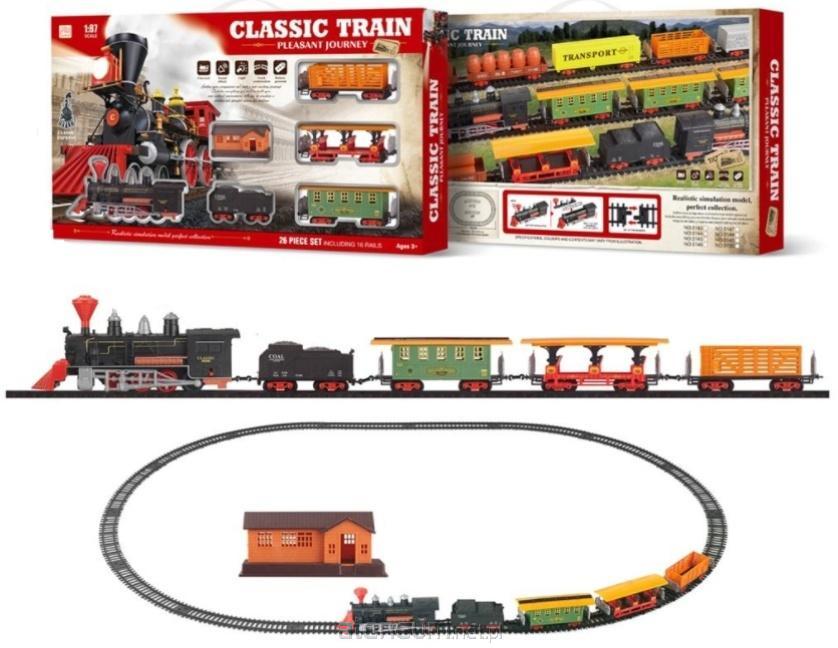 Pociąg-kolejka na baterie w zestawie z torami do złożenia w kształt owalu o szerokości ponad 150cm.