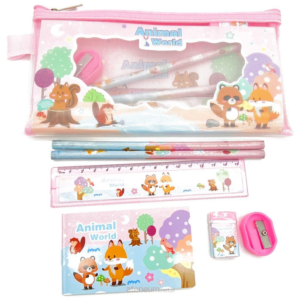 Zestaw przyborów szkolnych w skład którego wchodzą: piórnik, 2 ołówki, linijka, notesik, gumka, strugaczka.