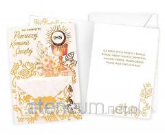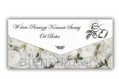 Karnet okolicznościowy z kopertą i życzeniami w środku.