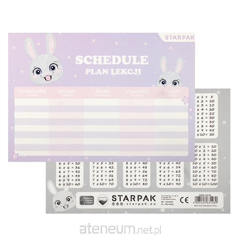 Plan lekcji jest niezbędnym elementem wyposażenia szkolnej wyprawki. Plan z kolekcji STARPAK Rabbit, zawiera podział na pięć dni tygodnia z 8 wierszami do wpisu, dzięki czemu żaden uczeń nie zapomni o potrzebnych mu danego dnia książkach czy zeszytach, dodatkowo na odwrotnej stronie posiada tabliczkę mnożenia. Przyjazna grafika sprawi, że każdy dzień w szkole będzie dobrze zaplanowany i udany. Zapoznaj się również z innymi produktami Starpak! Plan lekcji wykonany z papieru. Wyprodukowany w Polsce. Pakowany w folię po 25 sztuk. Wymiary produktu(szer. x wys.) [cm]: 23x16. Waga produktu w opakowaniu [kg]: 0,23 kg.