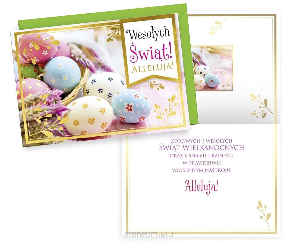 Kartka wielkości B6, zdobiona w zależności od wzoru metaliczną folią lub brokatem. Każda kartka posiada kolorowe życzenia w środku i dopasowaną kopertę w komplecie.