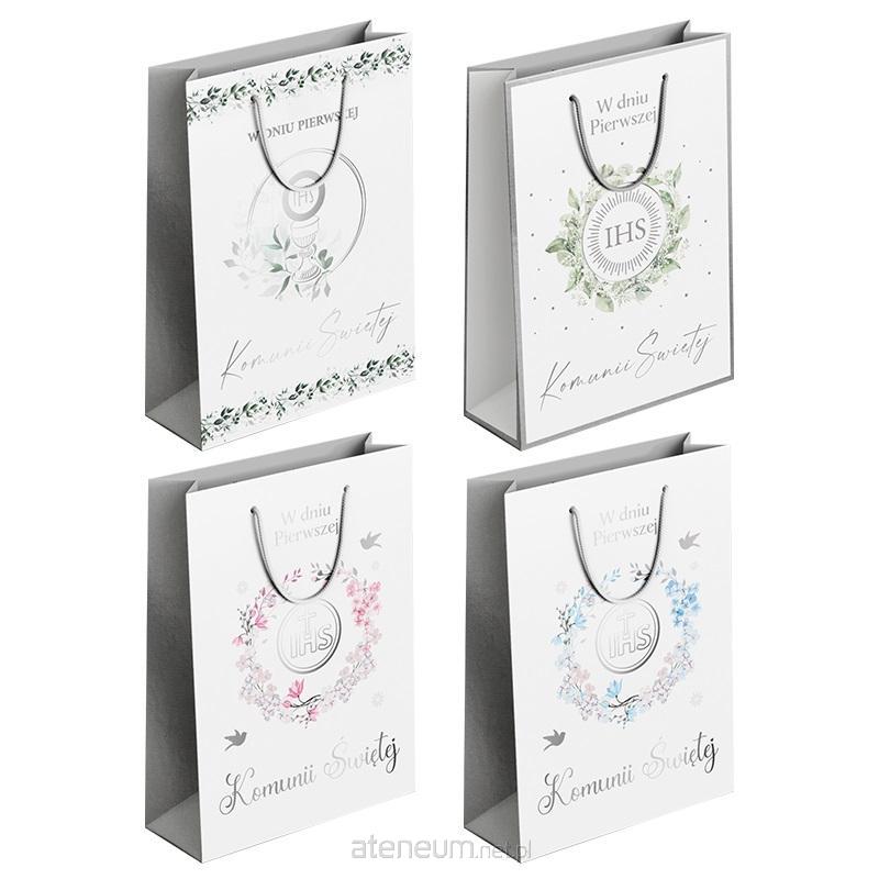 Torby prezentowe bogato ozdobione srebrną lub złotą folią. Gruby papier o dużej sztywności gramatura 210 g/m. Miks 4 wzorów wysyłany losowo