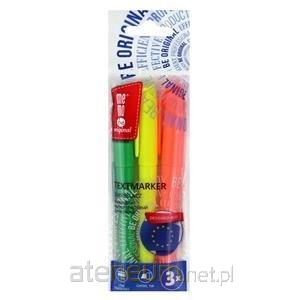 Zakreślacze w pisaku MemoBe ze ściętą końcówką. Idealne do zakreślania fragmentów tekstu i notatek. Obudowa wykonana z tworzywa w kolorze tuszu, z zatyczką z klipsem. Tusz na bazie wody w jasnych, intensywnych kolorach neonowych. Grubość linii pisania 1-4 mm. Zestaw 3 szt. w różnych kolorach w etui z zawieszką.