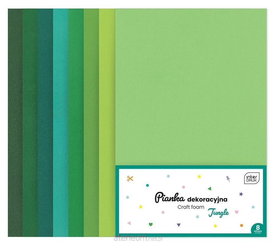 Zestaw JUNGLE zawiera osiem arkuszy pianki Eva w formacie A4 w rożnych odcieniach zieleni.